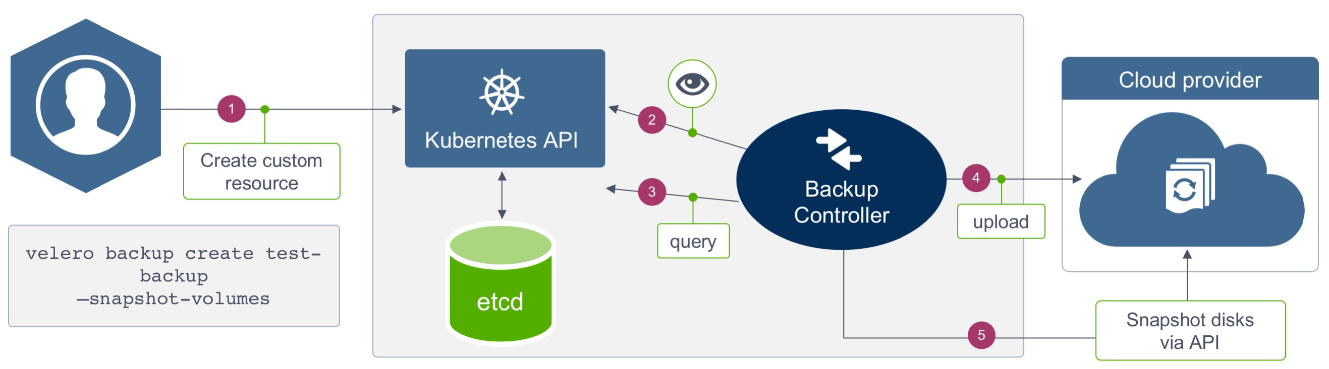 velero backup create k8s-backup-$TIME –kubeconfig ~/.kube/config –include-namespaces=default