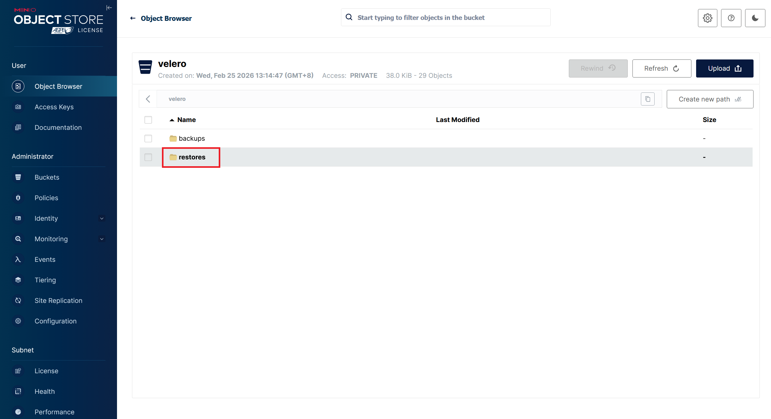 完成恢复后,会在MinIO存储中同时创建和一个和backups同级的restores的目录