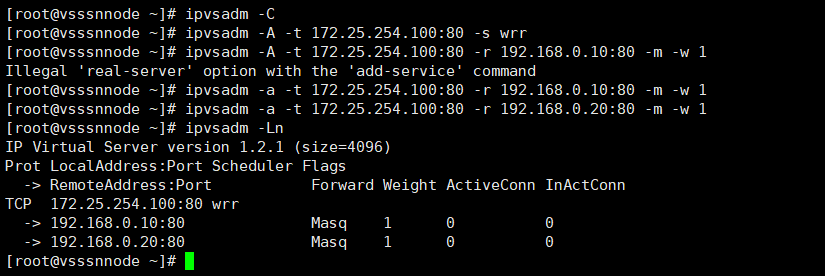 [root@vsssnnode ~]# ipvsadm -A -t 172.25.254.100:80 -s wrr 创建一个对外提供服务的 LVS 虚拟节点(VIP),指定用 “加权轮询” 算法分发请求。