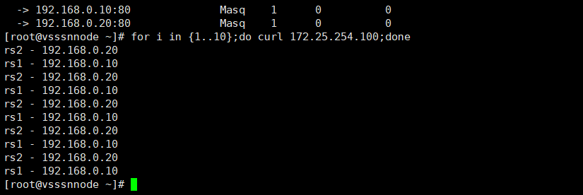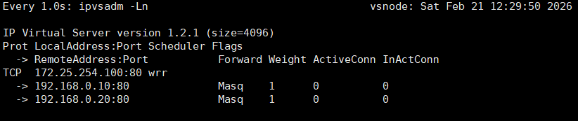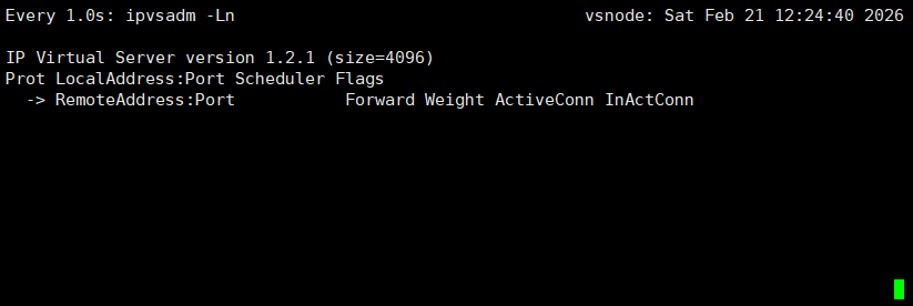 [root@vsssnnode ~]# ipvsadm -Ln 查看当前配置好的所有 LVS 规则(验证配置是否生效)