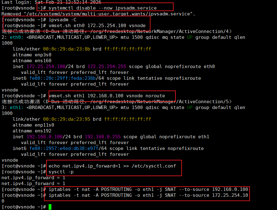 [root@vsnode ~]# iptables -t nat -A POSTROUTING -o eth0 -j SNAT –to-source 172.25.254.100