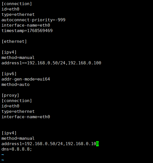 [root@vsnode ~]# vim /etc/NetworkManager/system-connections/eth0.nmconnection