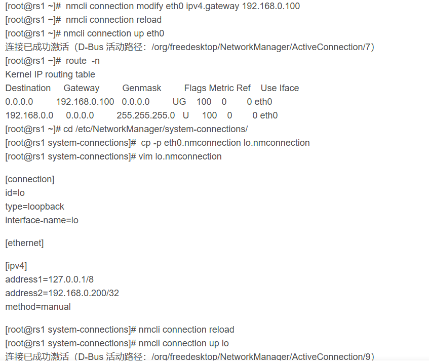 [root@rs2 system-connections]# echo 1 > /proc/sys/net/ipv4/conf/lo/arp_ignore 单独给回环网卡(lo)设置 arp_ignore=1,强化对 VIP 的 ARP 响应限制(因为 LVS DR 模式下 VIP 通常配置在 lo 网卡上)。