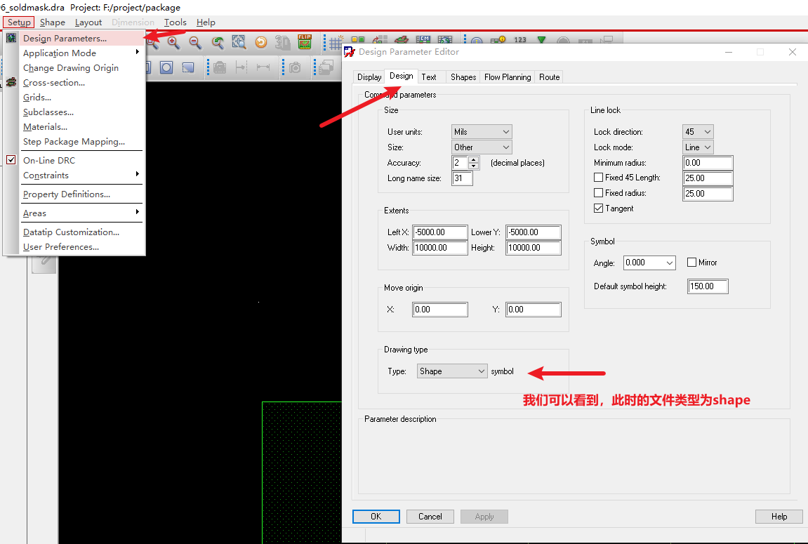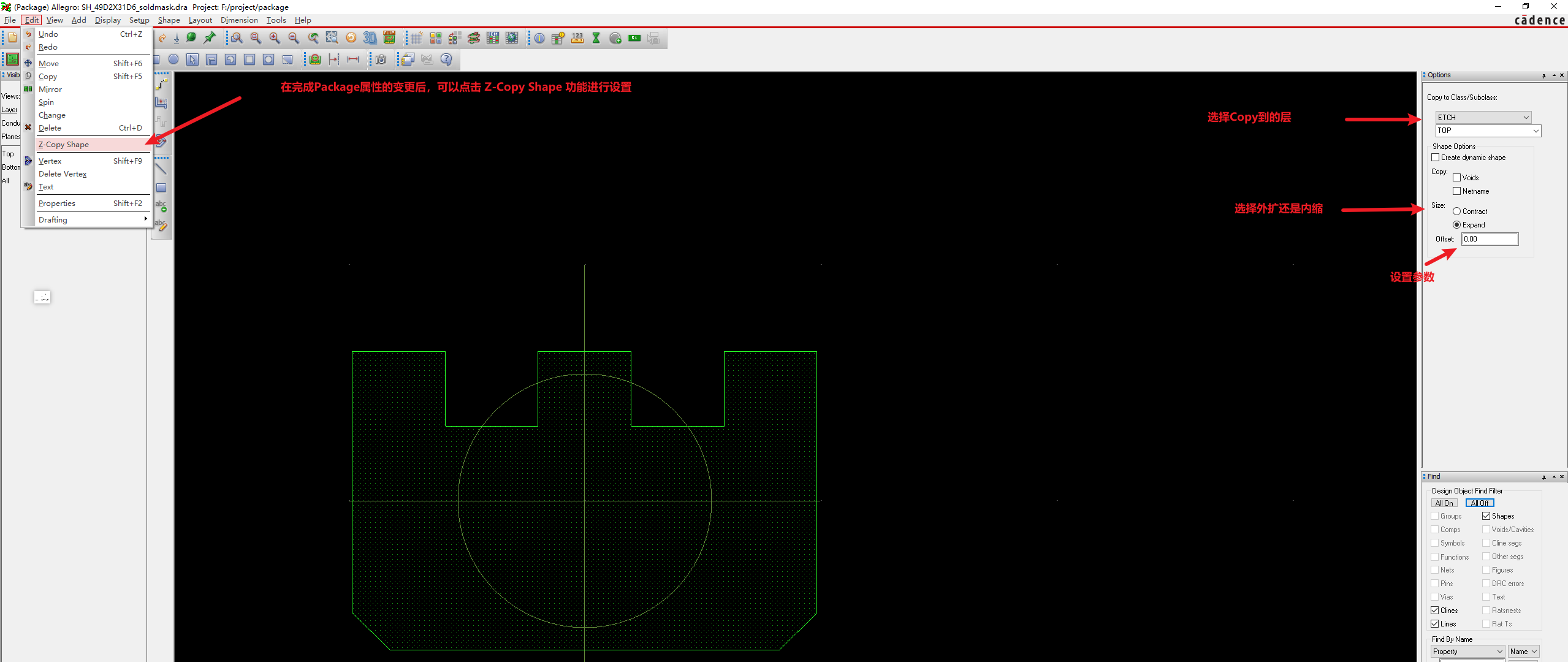 在Design Parameter Editor中可以看到当前的所展示的属性为 Shape symbol,在制作Soldmask层时需要用到Cadence中的一个功能即Z-copy,可以快速的帮我们完成图形的外扩和内缩。但使用时需要将Drawing type 变更为Package才可使用,不然该功能会为灰色,无法点击使用。