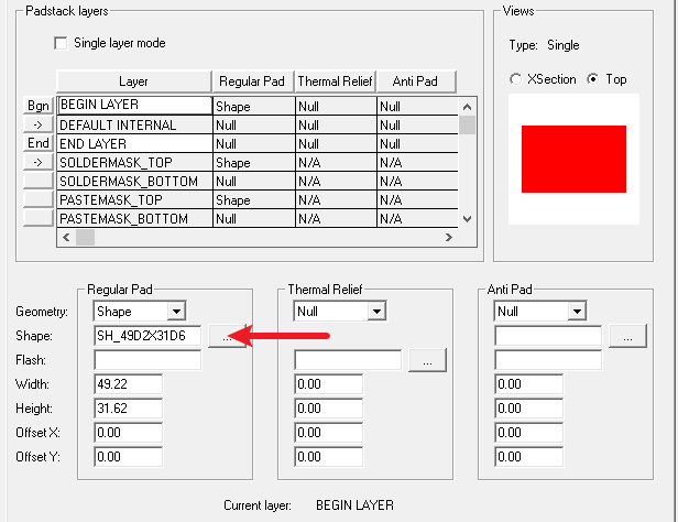 (注:此时Begin layer和Pastmask选择相同的形状,Soldmask选择外扩后的形状)