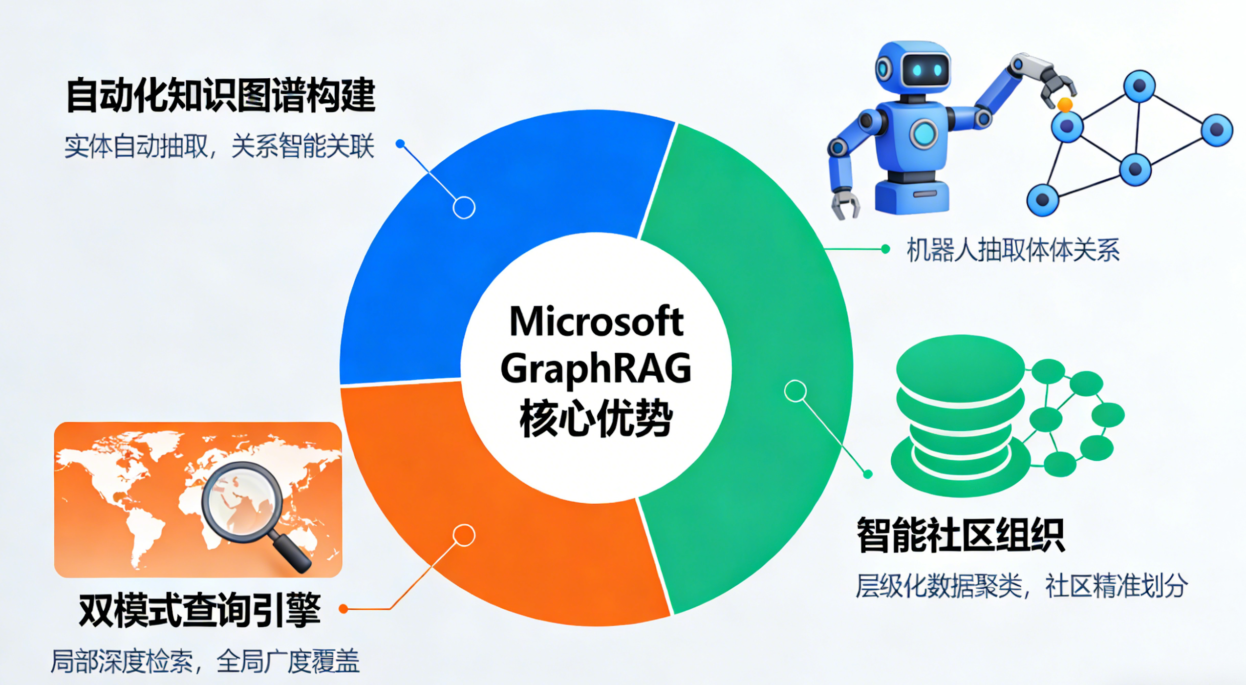 Microsoft GraphRAG作为代表性方案,其核心优势有三点: