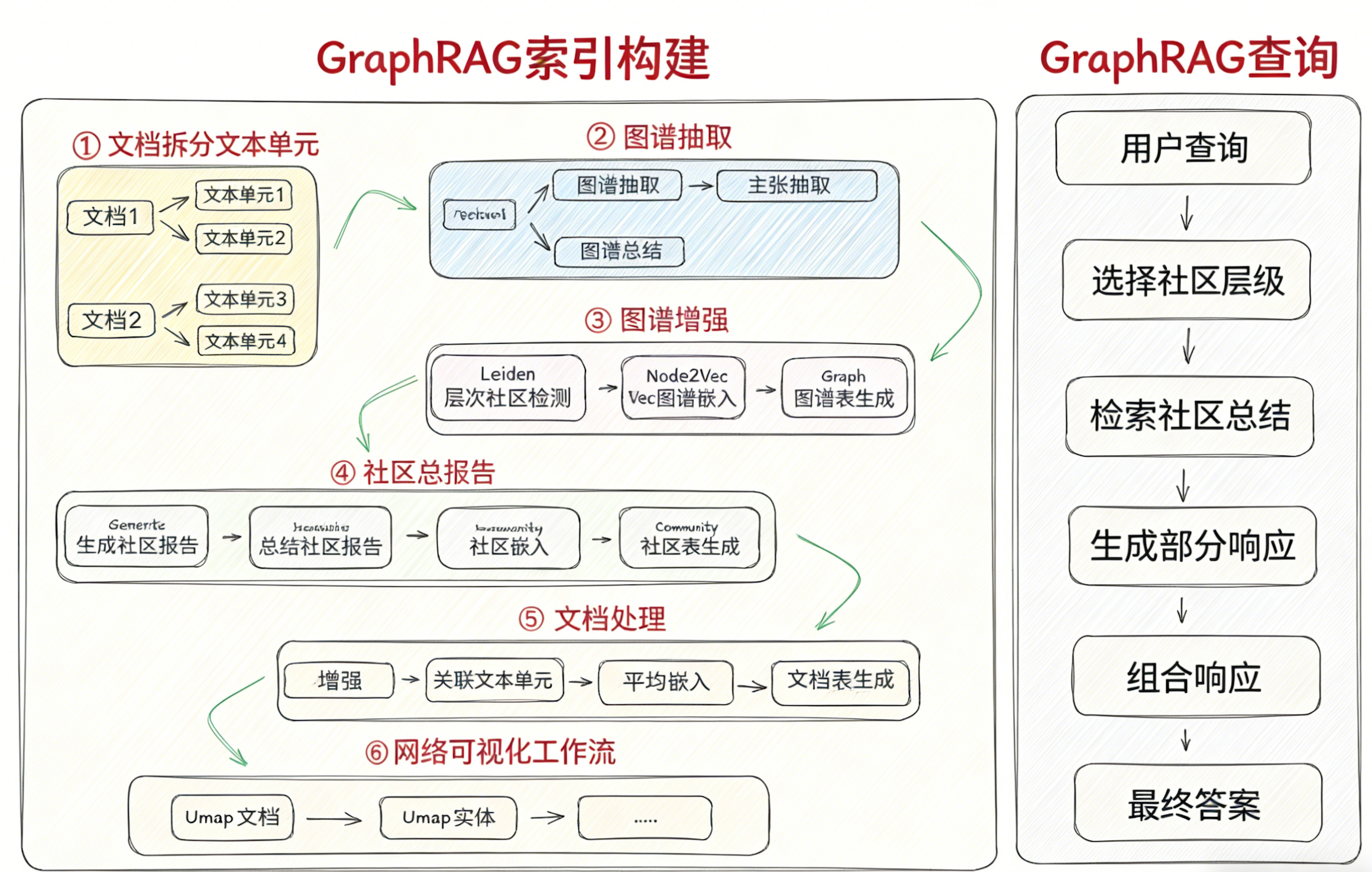 4. 摘要与向量化:为每个社区生成概括其核心主题的文本摘要,并将实体、社区、原始文本块编码成向量,构建向量混合索引