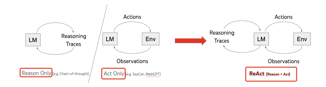 在当前AI Agent理论中,最具有基础性与代表性的要数ReAct模式,它是Yao等人于2022年在《ReAct: Synergizing Reasoning and Acting in Language Models》论文中提出,核心思想将推理(Reasoning)和行动(Acting)相结合。CoT提升的是LLM的推理能力,但它的缺点在于缺少与外部世界的交互从而缺少外部反馈来拓展自身的知识空间,ReAct弥补了这一缺陷。