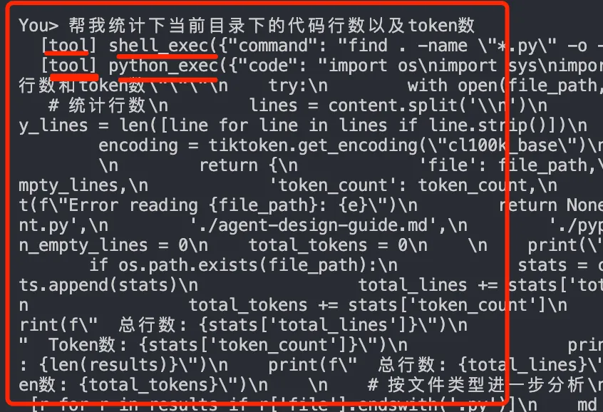 可以看到实现的Agent应用,虽然实现极简,但是功能可以一点不简单(当Agent拥有文件读写权限,外加Shell工具以及代码生成与执行权限,它在本机上真的可以"为所欲为")。