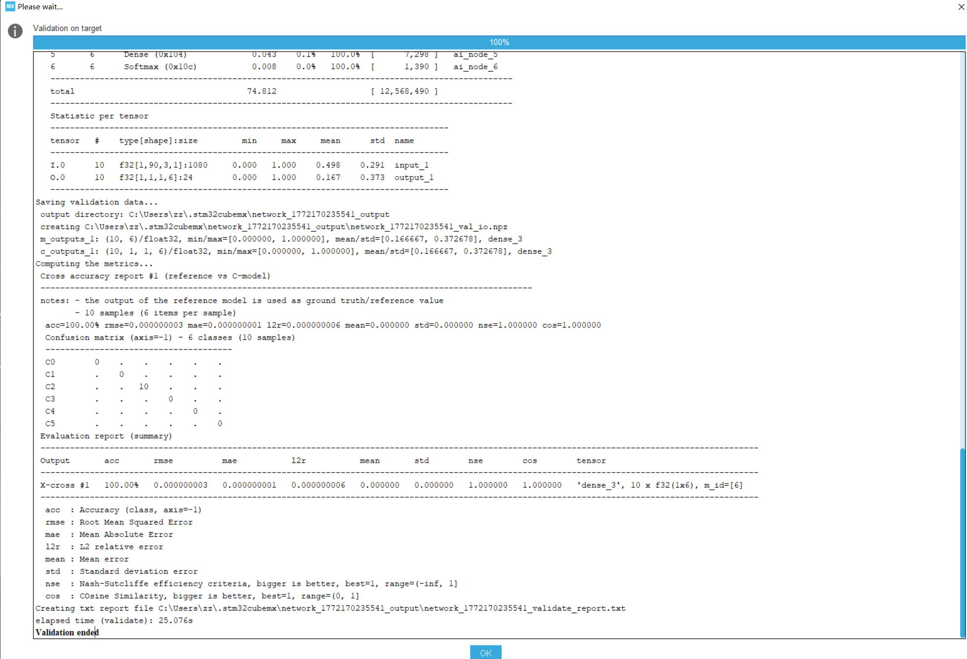 Analyze分析结果完毕后为绿色勾表明可用,然后跟着教程生成代码,通过MDK生成固件并烧录到单片机里面去,若烧录完毕,注意这时候在Validate on target的时候可能会报E200(ValidationError): TARGET: Unable to bind the ST.AI runtime with "network" c-model: [] 和 E801(HwIOError): Invalid firmware – COM7:115200两个错误,当然,如果你进行Validate on target的时候板子没上电则报错应该是E801(HwIOError): No SERIAL COM port detected (Board is not connected!)