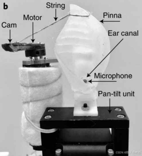 图 43.7: 仿生耳朵的外观。左侧是马达驱动的旋臂,通过细线牵动右侧的人工耳廓,使其产生振动以模拟蝙蝠耳廓上的多普勒效应。耳廓下方的麦克风用于接收声音信号。实验中,声源在仿生耳朵周围不同方向发出声音,收集大量不同方向的声音数据用于训练神经网络,最终得到一个灵敏的仿生耳朵。图片来源:Yin et al., 2021。