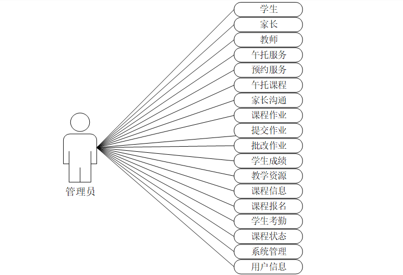 考虑到实际生活中在午托管理系统方面的需要以及对该系统认真的分析,将系统权限按进行划分。管理员登入使用本系统涉到的功能主要有学生、家长、教师、午托服务、预约服务、午托课程、家长沟通、课程作业、提交作业、批改作业、学生成绩、教学资源、课程信息、课程报名、学生考勤、课程状态、系统管理、用户信息等功能。管理员用例如图3-1所示。