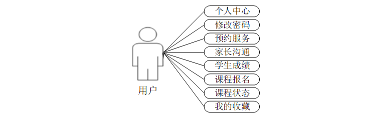 家长登入使用本系统涉到的功能主要有个人中心、修改密码、预约服务、家长沟通、学生成绩、课程报名、课程状态、我的收藏等功能。家长用例如图3-2所示。