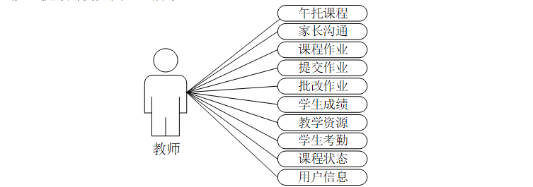 教师登入使用本系统涉到的功能主要有午托课程、家长沟通、课程作业、提交作业、批改作业、学生成绩、教学资源、学生考勤、课程状态、用户信息等功能。教师用例如图3-3所示。