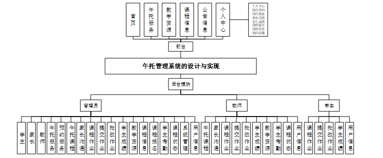 午托管理系统在设计与实施时,采取了模块性的设计理念,把相似的系统的功能整合到一个模组中,以增强内部的功能,减少各组件之间的联系,从而达到减少相互影响的目的。系统总体功能结构如图4-1所示。