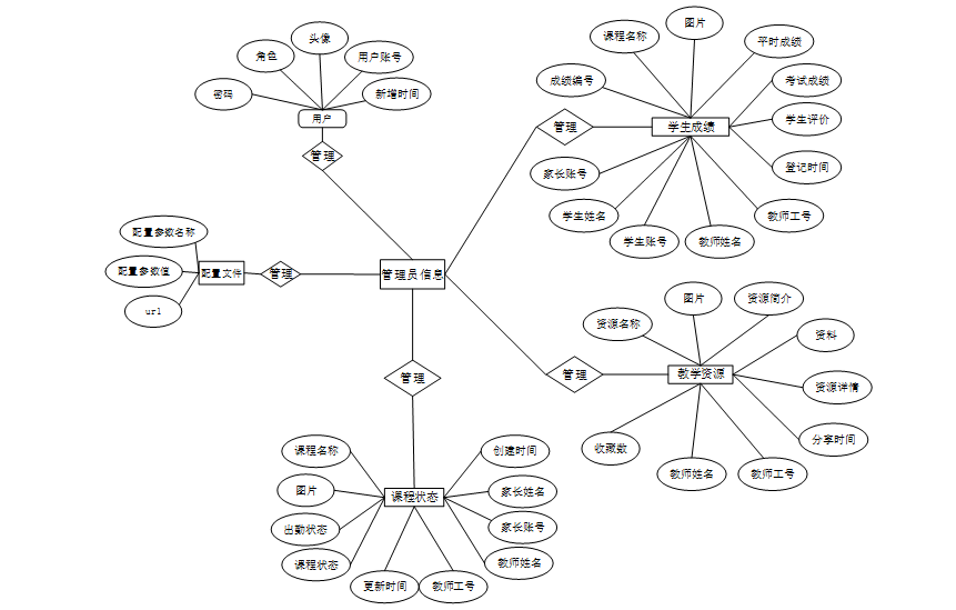 er实体(entity) 客观存在并可相互区别的事物称为实体。实体可以是实际的人、事或物,还可以是抽象化的概念或联络。在系统中将对“用户、学生成绩、教学资源、课程状态、配置文件”等几个主要的实体属性进行布局,系统主要er实体如图4-2所示。