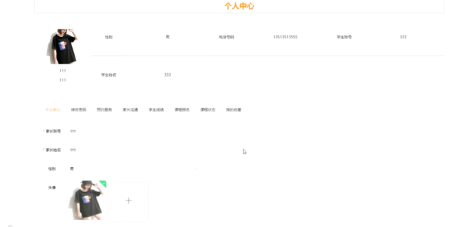 个人中心:在个人中心页面可以对个人中心、修改密码、预约服务、家长沟通、学生成绩、课程报名、课程状态、我的收藏等进行操作,如图5-5所示: