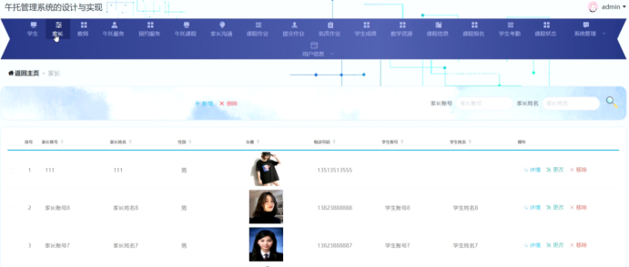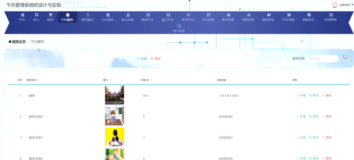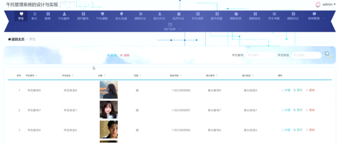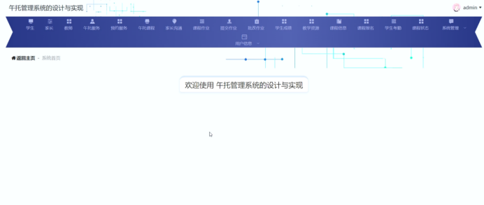 管理员进入主页面,主要功能包括对学生、家长、教师、午托服务、预约服务、午托课程、家长沟通、课程作业、提交作业、批改作业、学生成绩、教学资源、课程信息、课程报名、学生考勤、课程状态、系统管理、用户信息等进行操作。管理员主页面如图5-8所示: