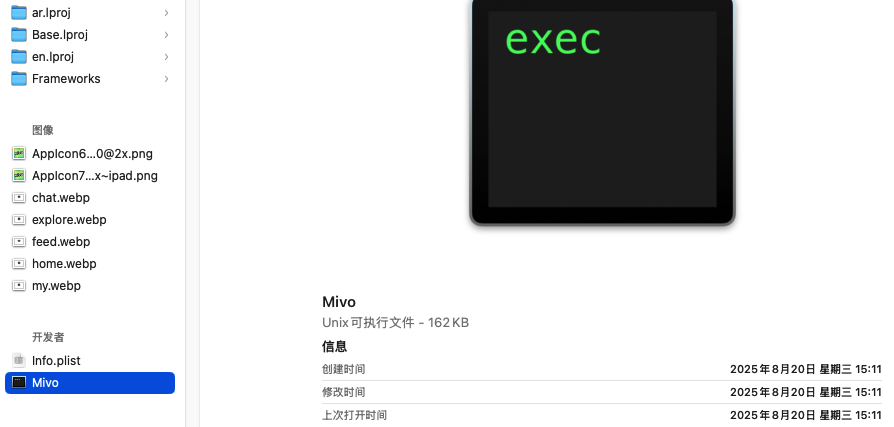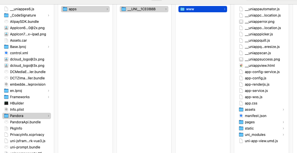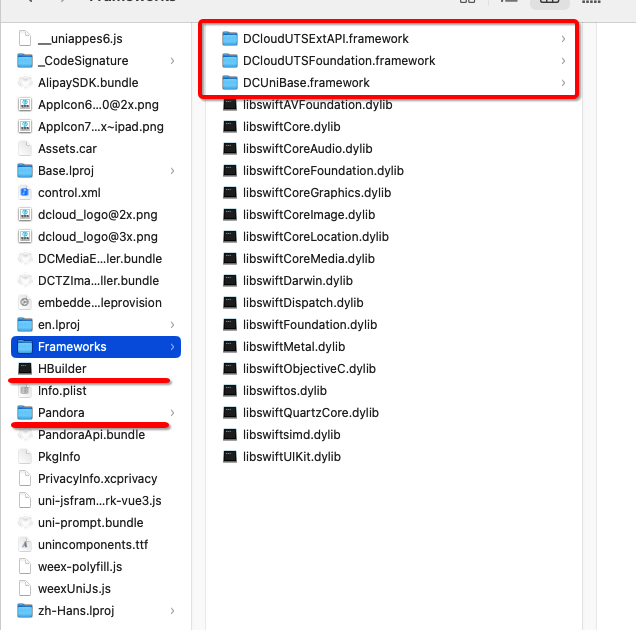 1: 一个可执行文件HBbuider 2: 两个动态库 DCloudUTSFoundation.framework,DCUniBase.framework