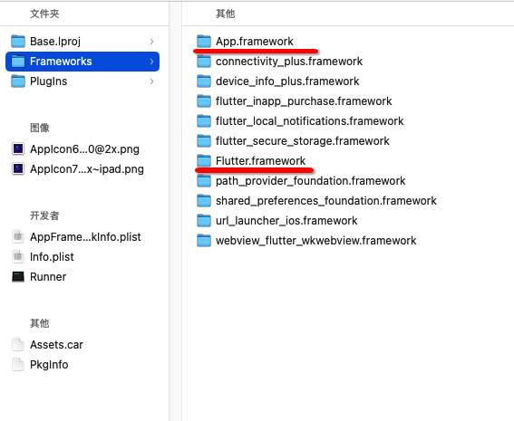 这里有两个重要的动态库 1: flutter.framework 这是flutter引擎库,每个工程都会集成, 不同的版本 导致这个库会有少许差距