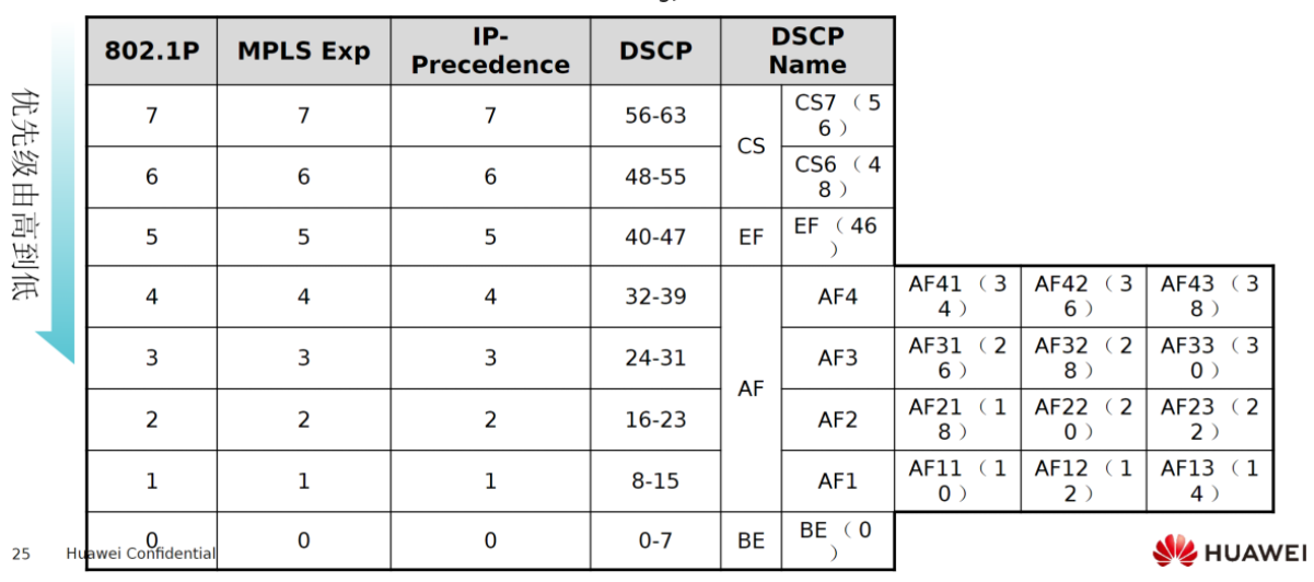 拥塞管理:拥塞管理匹配被拥塞避免放行的数据包中的DSCP等字段将数据包放入对应出接口的不同队列,最后根据合适的队列调度策略将数据包发送出去,每个出接口都有0-7一共八个队列,数值越高越优先发出,其各个队列分别对应下表数据包字段。