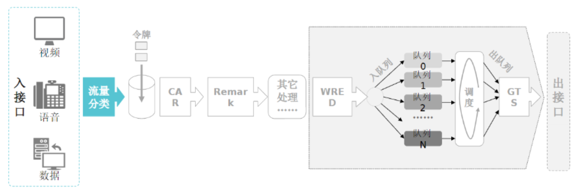 队列调度策略:队列调度策略有以下几种,FIFO先进先出、PQ优先级队列、RR轮询、WRR权重轮询、DRR赤字轮询、PQ加轮询机制、WFQ权值公平队列、CBQ基于类的队列。FIFO无视队列的优先级,先进入队列的先发出;PQ严格按照从7号队列至0号队列发出数据包;RR在每一次轮询严格从每个接口队列发出一个数据包;WRR为每个队列设置一个权重值,该值为每次轮询该队列可以发出的数据包个数,每小轮从数值高的队列开始依次轮询,每小轮每个队列只能发出一个数据包,队列发出一个数据包后会在队列计数器上减一,某队列计数器减为0则本次轮询无法继续发送数据包,然后一直重复此操作,直至所有队列计数器为0则本轮结束,将计数器恢复为设置的权重值,再开始下轮轮询,WRR只关心数据包的数量;DRR每轮轮询会给每个队列补充设置的金额,若金额大于零则可以发送数据包,小于零则无法发送,例如通过配置0号队列每轮可以补充200金额,若此时剩余金额为1,当本轮调度到0号队列需要发送1000byte数据包,则将该数据包发送出去后金额为-999,后续若要继续发送数据包,则需要等到5轮后金额又为1时才能再发送数据包,DRR只关心数据包的大小;PQ加轮询策略将高优先级的队列例如将5-7号队列设置为PQ,0-4设置为WRR或DRR,只有设置为PQ的队列将数据包发送完后才能发送RR,并且PQ可以随时插队;WFQ根据管理员的配置能够将DSCP等字段映射为权值,并且能够综合数据包的大小,让权值高、数据包小的优先转发,从而降低总体转发时延;CBQ除了使用出接口0-7物理队列,还使用BE、AF、EF三种逻辑队列,管理员可以通过配置将物理队列映射为逻辑队列,默认BE队列,AF队列确保带宽,EF队列优先转发并且可以限制最大带宽,使用CBQ可以简化管理员的配置。