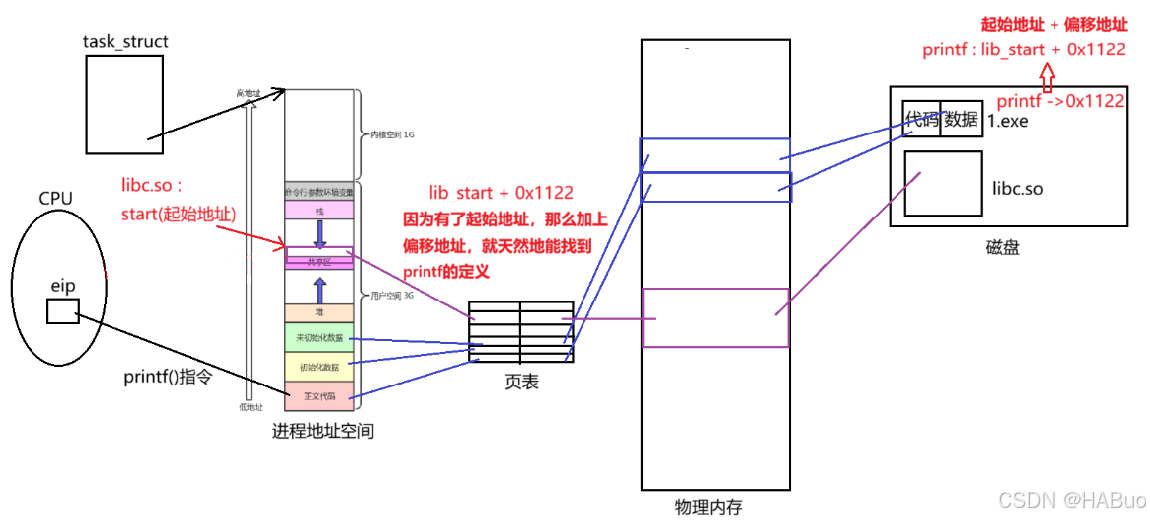 —> printf在自己的虚拟地址空间就可以直接跳转到共享区执行printf,通过页表找到对应的库中的实现