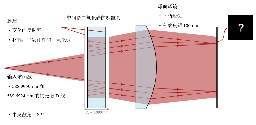 1. 光源(钠原子光谱D线) 2. 高反射膜层 3. 标准具 4. 自由空间传播 5. 球面透镜 6. 探测器 可用的自由空间传播的建模技术: