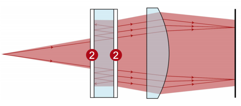 法布里-珀罗标准具广泛应用于激光谐振器和光谱的敏感波长滤波。通常,它们是由具有两个高反射性(HR)膜层的平面组成,中间有空气或玻璃。在本例中,建立了一个中间介质为石英的光学测量系统来实现在VirtualLab Fusion中测量钠原子光谱D线。利用我们的无缝衔接的非序列单平台互操作性,充分考虑了标准具中多次反射引起的干涉效应,并研究了添加膜层的反射率后对条纹对比度的影响。 建模任务
