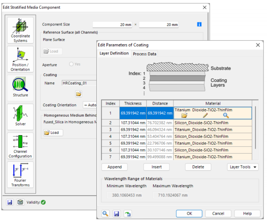 对于膜层的标准具表面,我们使用分层介质组件,因为它为x,y不变的层堆栈提供了一个快速和严格的解决方案。膜层定义为二氧化钛和二氧化硅薄膜交替,其反射率随着迭代次数的增加而增加。关于分层介质组件的更多信息如下: