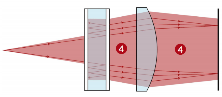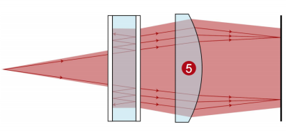 同样的原理也适用于其他的自由空间传播步骤。 连接建模技术:球面透镜 1. 光源(钠原子光谱D线) 2. 高反射膜层 3. 标准具 4. 自由空间传播 5. 球面透镜 6. 探测器 可用的与曲面的交互作用的建模技术: