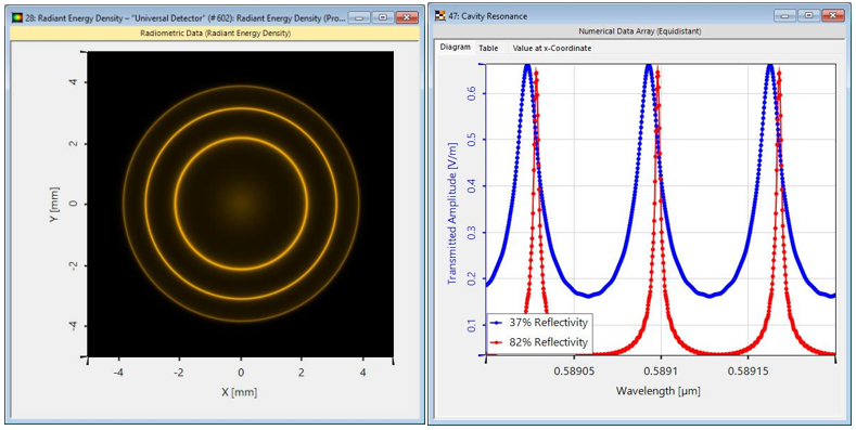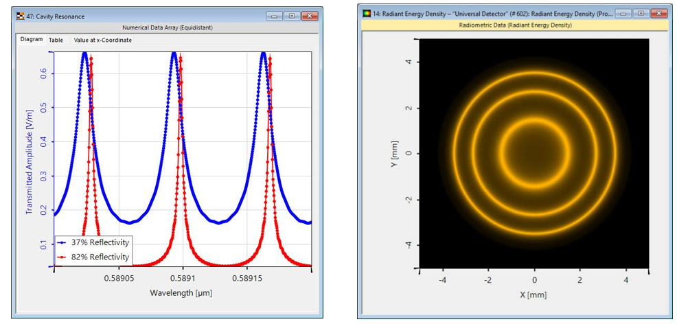VirtualLab Fusion的灵活通用探测器以及各种参数变化工具允许对任何光学系统进行深入研究。在此案例中,我们想测量探测器处的辐射能量密度,并研究其与膜层的波长和反射率的关系。 仿真结果 两个频谱线的可视化