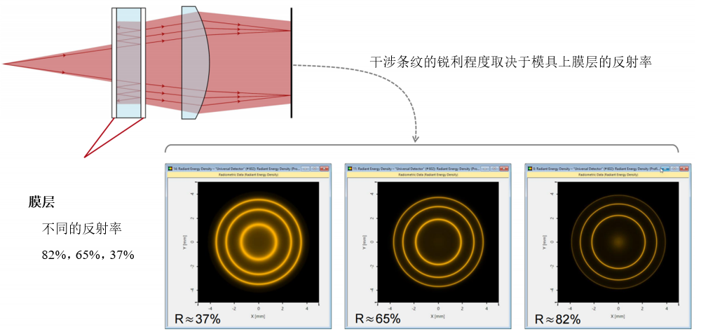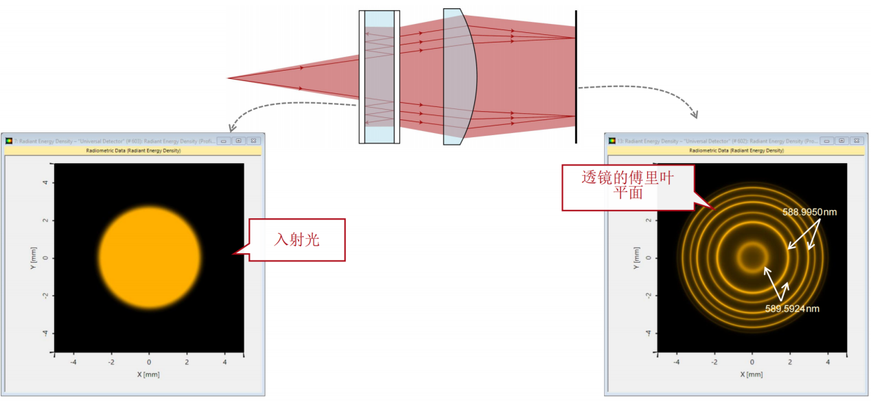 1. 光源(钠原子光谱D线) 2. 高反射膜层 3. 标准具 4. 自由空间传播 5. 球面透镜 6. 探测器 连接建模技术:膜层 1. 光源(钠原子光谱D线) 2. 高反射膜层 3. 标准具 4. 自由空间传播 5. 球面透镜 6. 探测器