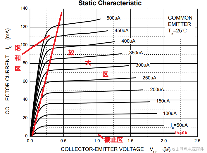 输出特性是指 Ib 固定时,集电极电流 Ic 与 Vce 的关系曲线,是三极管三个工作区的直观体现,也是电路设计的核心参考:
