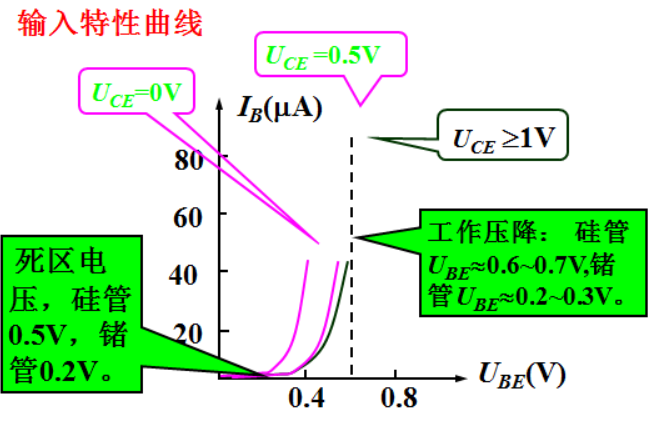 - 定义:发射结正偏导通时的正向压降,硅管常温 25℃下典型值 0.6~0.7V,锗管 0.2~0.3V