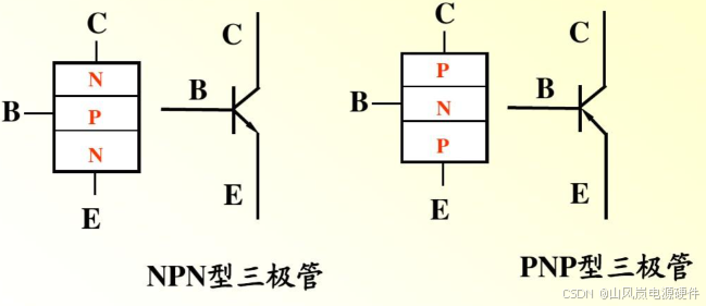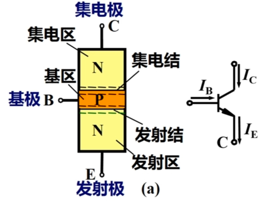 NPN 三极管由三层半导体纵向堆叠而成,从外到内依次为: