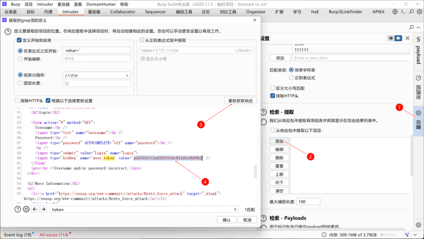 - 对user_token的Payload类型选择递归提取,并填入初始请求的有效token(抓包获取的原始token)。