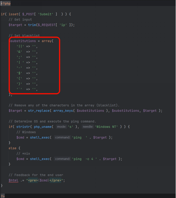 High 难度对管道符等命令分隔符做了黑名单过滤,但过滤代码存在空格书写错误,导致过滤失效,可构造无空格的命令拼接Payload。