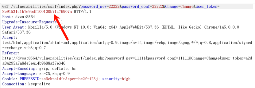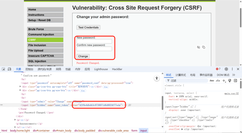 High 难度新增user_token 验证,token 明文显示在前端HTML源码中,单纯构造CSRF链接无法绕过,需配合XSS漏洞提取token后组合攻击。