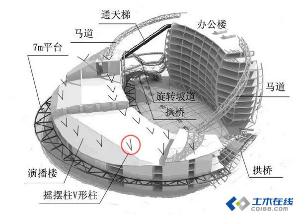 工程地下部分为一个整体结构单元,最大平面轮廓尺寸为直径约119m的近似圆形。工程地上由六大部分组成,但是这六个部分之间并不是完全独立的,形成了一个非常复杂的结构体系。具体情况如下: