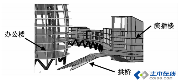 (3)连接办公楼及演播楼的东西向钢结构拱桥,见图2,3。钢结构拱桥两端分别支承于办公楼和演播楼的地下室顶板沿桥方向的混凝土墩上。此处钢结构壳体不落地,形成一个空腔,拱桥作为钢结构的一个支承位于空腔的底部。