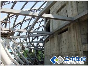 (5)罩在办公楼与演播楼上的是一个屋盖外壳钢结构,见图4。在地上屋盖钢结构从±0.00标高起,将办公楼和演播楼连为一体。外壳钢结构主要支承体系有四大部分:1)钢结构直接落地(图5中黑粗线部分);2)办公楼外挂支座(图6);3)演播楼顶摇摆柱V形柱(图7);4)空腔部分支承在拱桥上。另外,在演播楼7.0m标高处设有一圈钢结构平台,一端与演播楼铰接,另一端与外壳钢结构采用滑动支座连接(图7)。图8,9为摇摆柱V形柱和7m平台的施工照片。