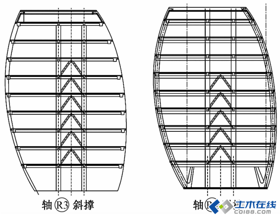 图12 办公楼轴R3和轴R9 沿高度布置的钢斜撑