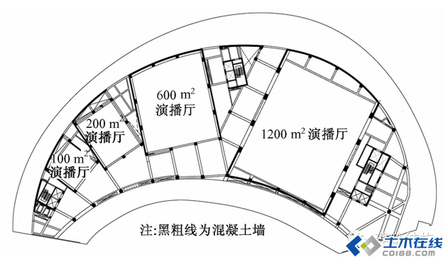 (2)演播楼采用钢筋混凝土框架剪力墙结构,柱尺寸以800mm×800mm的方形截面为主,墙厚为300,400mm,梁截面以600mm×700mm为主。