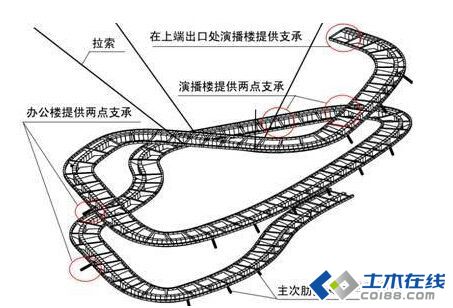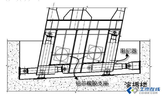 图14旋转坡道为宽度3m,总长235m的钢结构,标准断面见图15,分别支承在演播楼、办公楼以及外壳钢结构上,支承点如图14所示,局部设拉索(带拉索节点断面见图16)。在坡道端部进行了减隔震设计,一方面通过隔震支座减小外壳与演播楼的拉接刚度,减小支座反力;另一方面通过阻尼器及支座的铅芯耗散能量,降低坡道面的水平振动(如图17所示)。