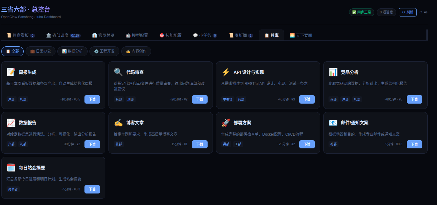 这里还内置了很多的"圣旨"库,这里是工作模板,点击下旨然后填入对应需求就可以直接让openclaw开始工作了。