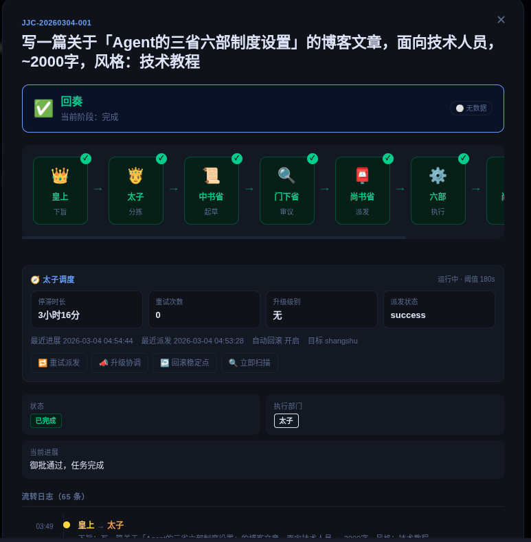 皇上 → 太子分拣 → 中书规划 → 门下审议 → 已派发 → 执行中 → 待审查 → ✅ 已完成