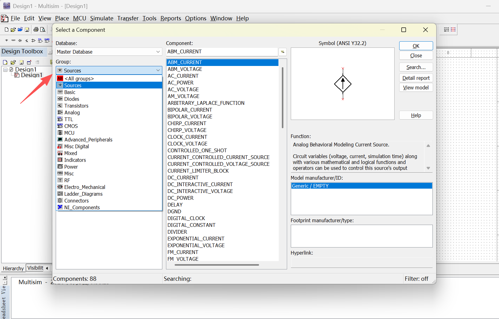 Sources包含各种电源和信号源,如直流源、交流源、脉冲源、受控源等,为电路提供激励和能量。