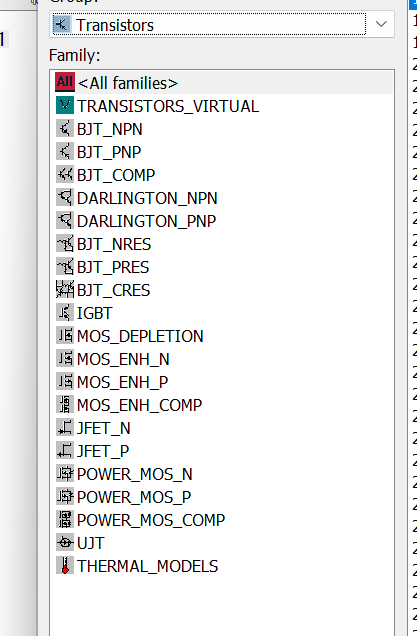 <All families>(所有元件)显示当前组下的所有晶体管及相关元件,方便快速浏览和查找。